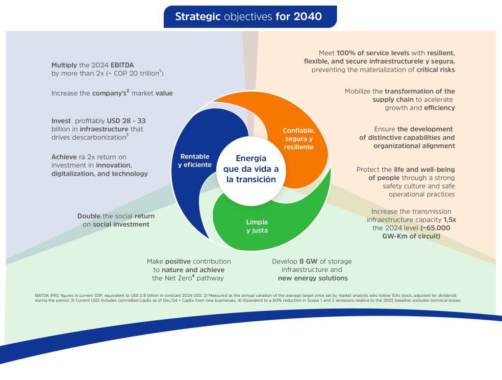 Our strategy seeks to balance growth, the diversification of our portfolio, and the strengthening of our position in the electric energy businesses. All of this aims to optimize capital investment and generate value for our shareholders and various stakeholders. Thus, the ISA2040 strategy establishes seven fundamental emphases that represent our main choices for the 2025-2040 horizon