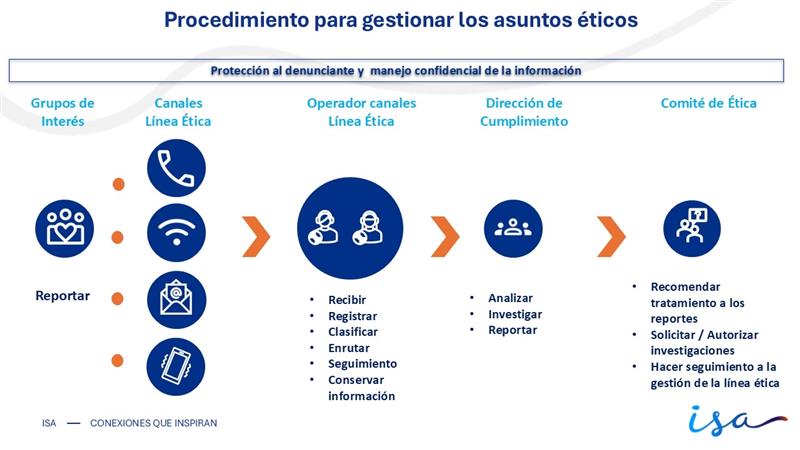 Las consultas, Reportes o Denuncias de Asuntos Éticos, pueden hacerse de manera anónima en aquellos casos donde el denunciante lo solicite al operador de los canales de recepción, para lo cual ISA y sus Empresas han dispuesto que la identificación del denunciante es opcional. No obstante, ISA y sus empresas animan a revelar la identidad de quienes reportan o denuncian estas situaciones, con el fin de favorecer la obtención de información que permita una mayor efectividad en la gestión del Asunto Ético.