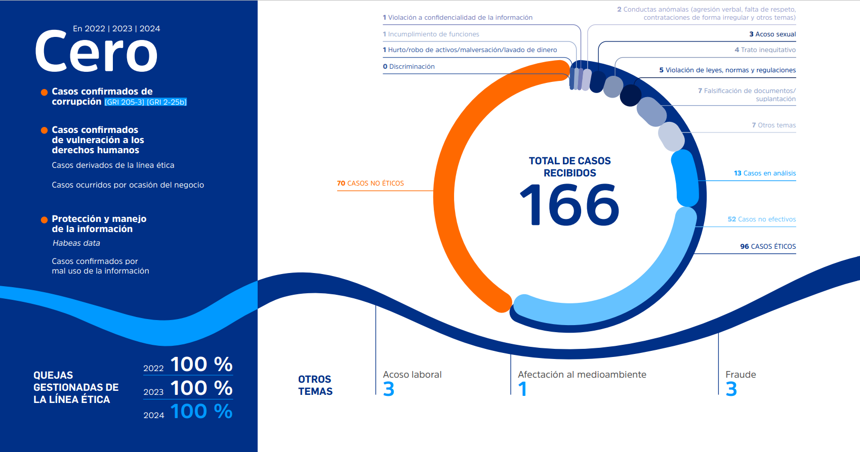Como parte del monitoreo al cumplimiento del Programa Empresarial de Ética y Compliance, abrimos la Línea Ética a través de la cual, los grupos de interés pueden reportar el incumplimiento de lo definido en el programa, particularmente en lo relacionado con fraude, corrupción, soborno, lavado de activos y financiación del terrorismo.